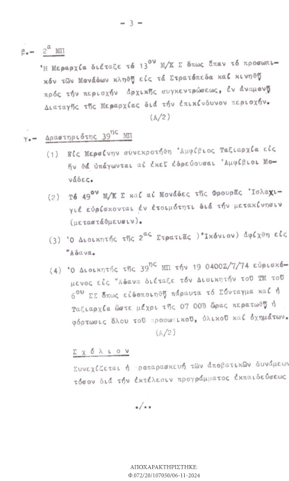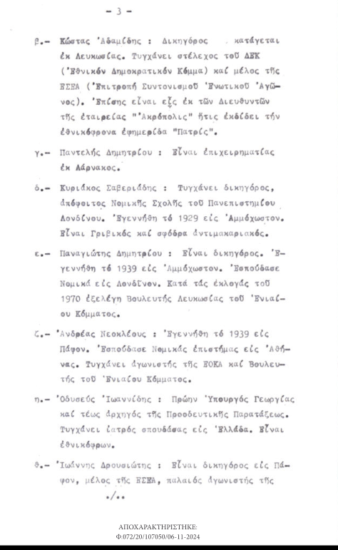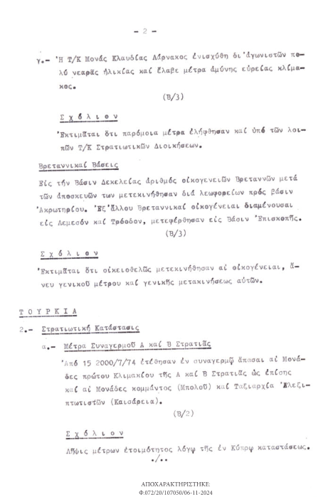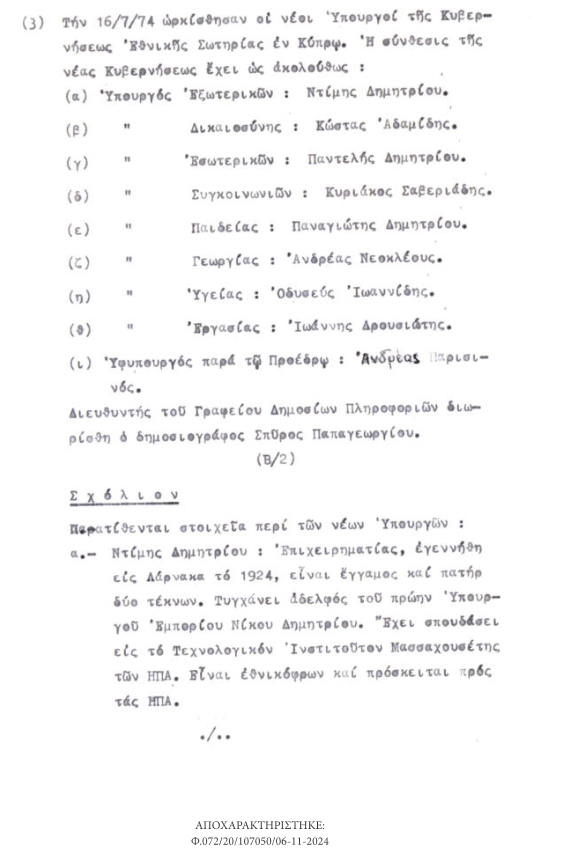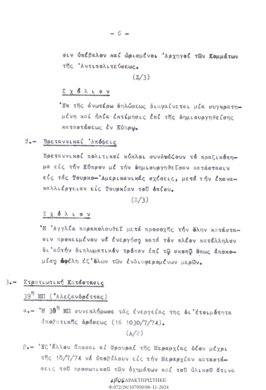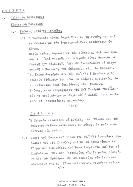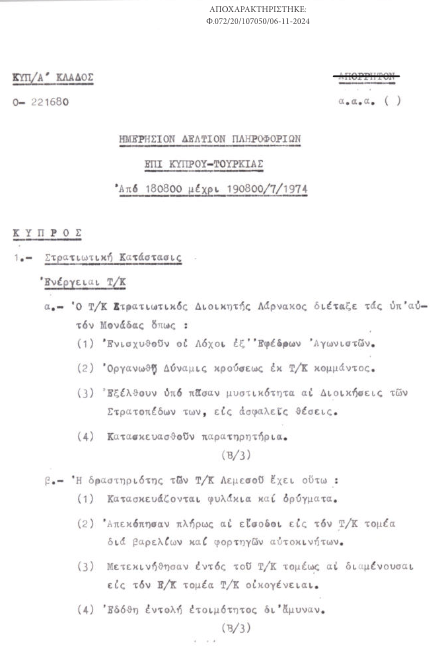 Σχετικὰ μὲ τὴν εἰσβολὴ στὴν Κύπρο, τὰ ἀποχαρακτηρισμένα ἔγγραφα ἀποκαλύπτουν ὅτι ἡ τότε Κεντρικὴ Ὑπηρεσία Πληροφοριῶν, διέθετε καὶ εἶχε συμπεριλάβει στὰ δελτία πληροφοριῶν στοιχεῖα ποὺ καθιστοῦσαν σαφὲς τὸν κίνδυνο τῆς τουρκικῆς εἰσβολῆς, ἂν καὶ φαινόταν πὼς ἡ Ἄγκυρα ἐπιθυμοῦσε νὰ ἀποφύγει μιὰ γενικευμένη σύγκρουση μὲ τὴν Ἑλλάδα.